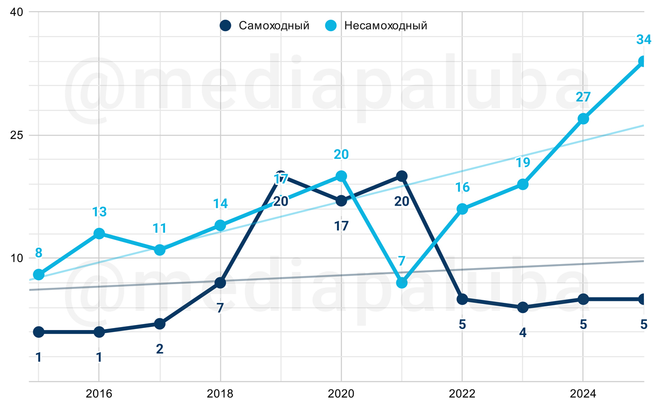 В 2025 году в категории несамоходного технического флота было построено 12 судов. На перспективе 10 лет ничего особенного сказать нельзя, подобное количество судов этой категории наблюдается из года в год.
